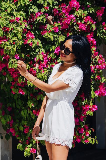 Today I'm wearing white my absolute favorite color to wear during Summer. The weather here is heating up and there is almost no need to cover up. I love the easiness of a playsuit/romper/jumpsuit. It is the easiest thing to style and transitions perfectly from day wear to a night out and from casual to smart Just accessorize it differently for the time or occasion. I love the lace trimmings at the bottom and the sleeves. The wrap design of this romper/playsuit makes for a deep plunging V-neck which is so in fashion now. I love EVERYTHING about this romper, the color, the cut, the fit and the fabric and of course, the price is super affordable.